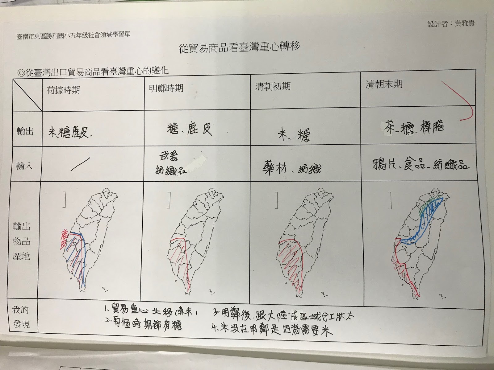 課程最後進入分析不同時期的物產變化,以此推論、了解該時代的社會背景。學生利用分析矩陣,羅列各時期的進出口物產,找出了臺灣一直有糖的輸出、臺灣在清代後與大陸形成區域分工、從臺灣物產的變化看到經濟重心的北移,當然,在明鄭時沒有米的輸出,是因為臺灣內部需求為重;清朝沒有鹿皮的輸出是因為鹿的數量減少,這些不同時期的物產變化的背後原因早已在我們討論之列。末了,便是討論有關學生們在意的,臺灣開港後有鴉片輸入這件事。鴉片的輸入,學生們推論代表臺灣亦有吸食人口,聯結課程最初的鴉片戰爭,我們談臺灣為何會吸鴉片?嚴重的程度及臺灣的吸鴉戒毒史。